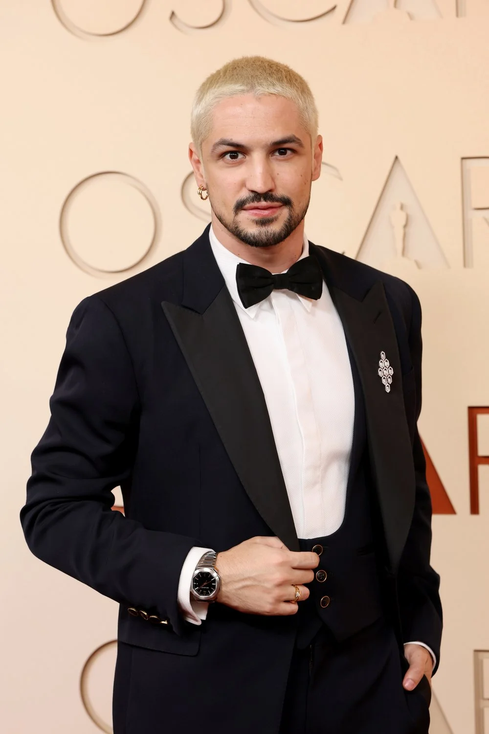 演员Pedro Pascal以Chanel男装造型亮相并担任颁奖嘉宾。他身着白色棉府绸礼服衬衫,饰以珍珠纽扣与羽毛胸针,搭配黑色礼服裤与腰封,并佩戴Chanel BOY·FRIEND腕表与品牌配饰,展现经典绅士气质。