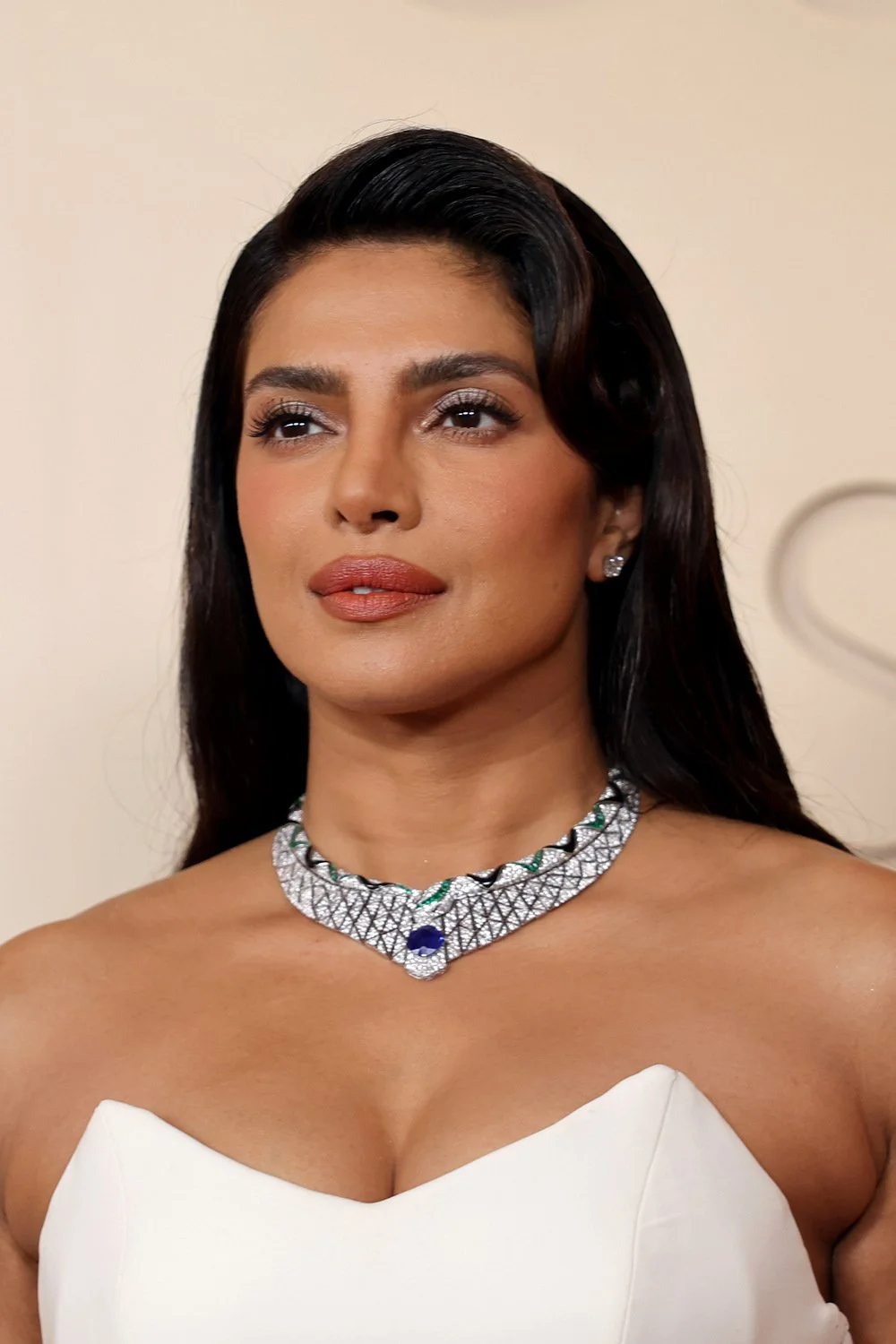 宝格丽全球大使Priyanka Chopra Jonas佩戴Serpenti Illusio高级珠宝项链惊艳亮相:这件作品中央镶嵌一颗来自马达加斯加的14.01克拉古董垫形切割蓝宝石,搭配钻石、祖母绿与缟玛瑙的大胆组合。项链由235个部件组成,耗时超过1300小时打造,通过几何图案逐渐勾勒出蛇形轮廓,宛如一件现代珠宝雕塑。她同时搭配高级珠宝钻石戒指与钻石耳环,整体造型璀璨夺目。