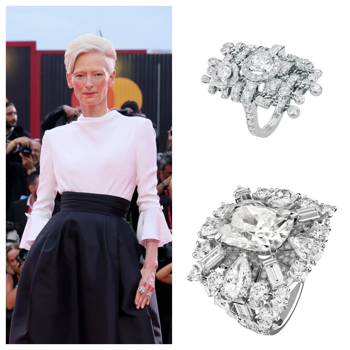 香奈儿品牌形象大使 Tilda Swinton佩戴香奈儿臻品珠宝N°5系列 DIAMOND SILLAGE 戒指与 TWEED 系列 TWEED BRODÉ 戒指