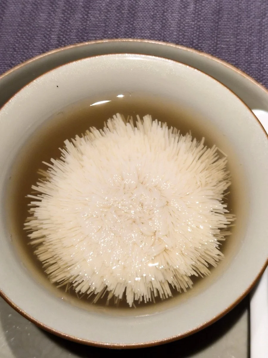 AKEN的破局之道,展现了一位主厨的思考深度。他毅然将这份精妙的刀工从汤品的语境中剥离,赋予其全新的形态与使命。一场历时三天的蜕变开始了!最终,一道形如地质化石、底藏豆腐原浆的艺术品诞生了。它保留了客家五指毛桃的味觉灵魂与淮扬菜的视觉匠心,却以现代甜品的姿态,完成了从“借鉴”到“超越”的升华。