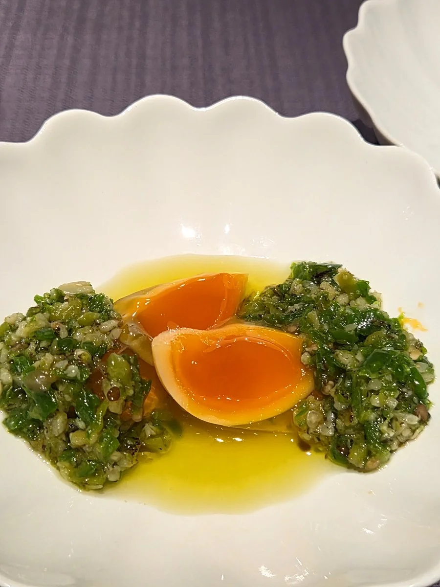 客家的精致之旅,常从一道看似寻常却内藏乾坤的开胃小菜开始。AKEN寻得福建龙岩的黄金皮蛋,其醇厚风味成为绝佳基底。但他并未止步于此,巧妙以湖南的跳跃泡椒,最后点睛以广东五华糯米醋的柔和酸香。