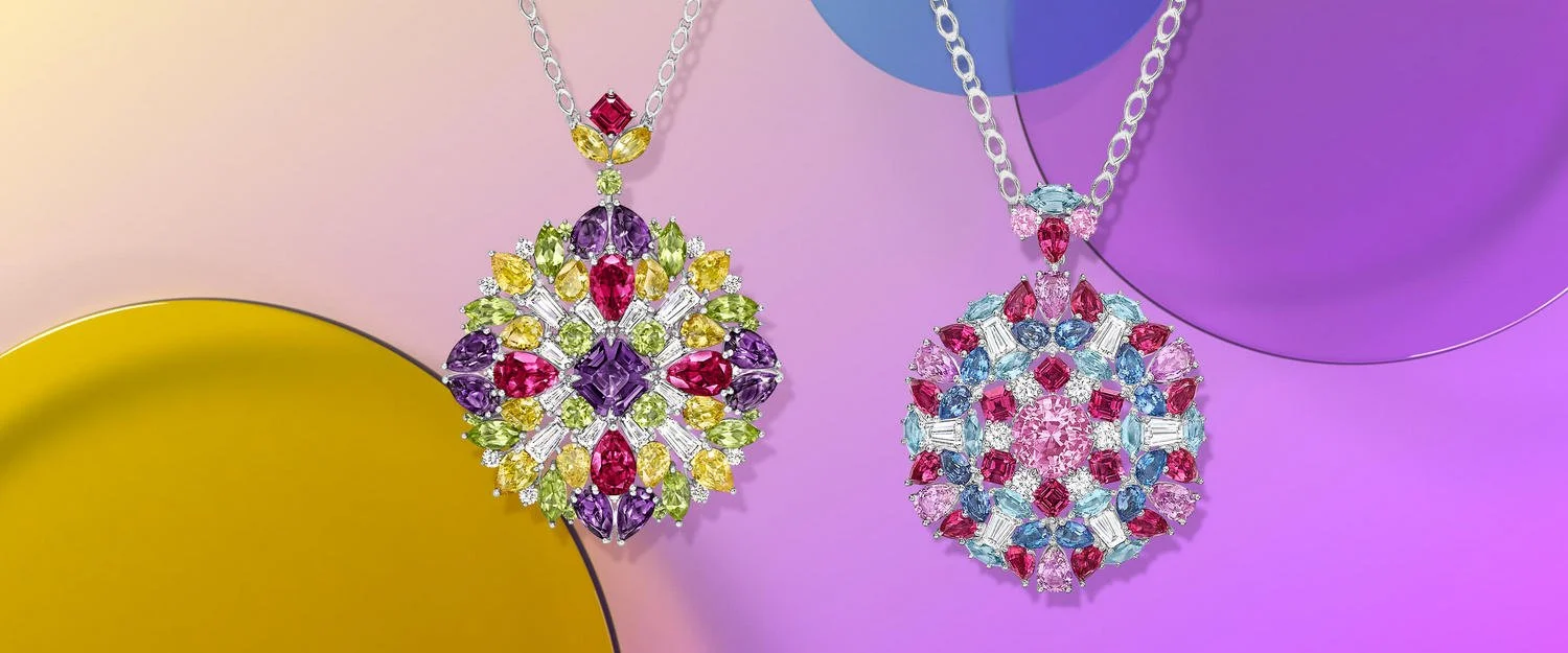 沉醉于万花筒的奇妙梦境,邂逅灵动生机。 Winston Kaleidoscope 高级珠宝系列坠链, 橄榄石与沙弗莱石、紫色蓝宝石与海蓝宝石等中央宝石演绎绚丽缤纷的色彩盛宴。华光熠熠的彩宝与璀璨钻石交相辉映,似将万花筒里流转的光影凝于颈间,让灵动与闪耀成为触手可及的夏日惊喜。