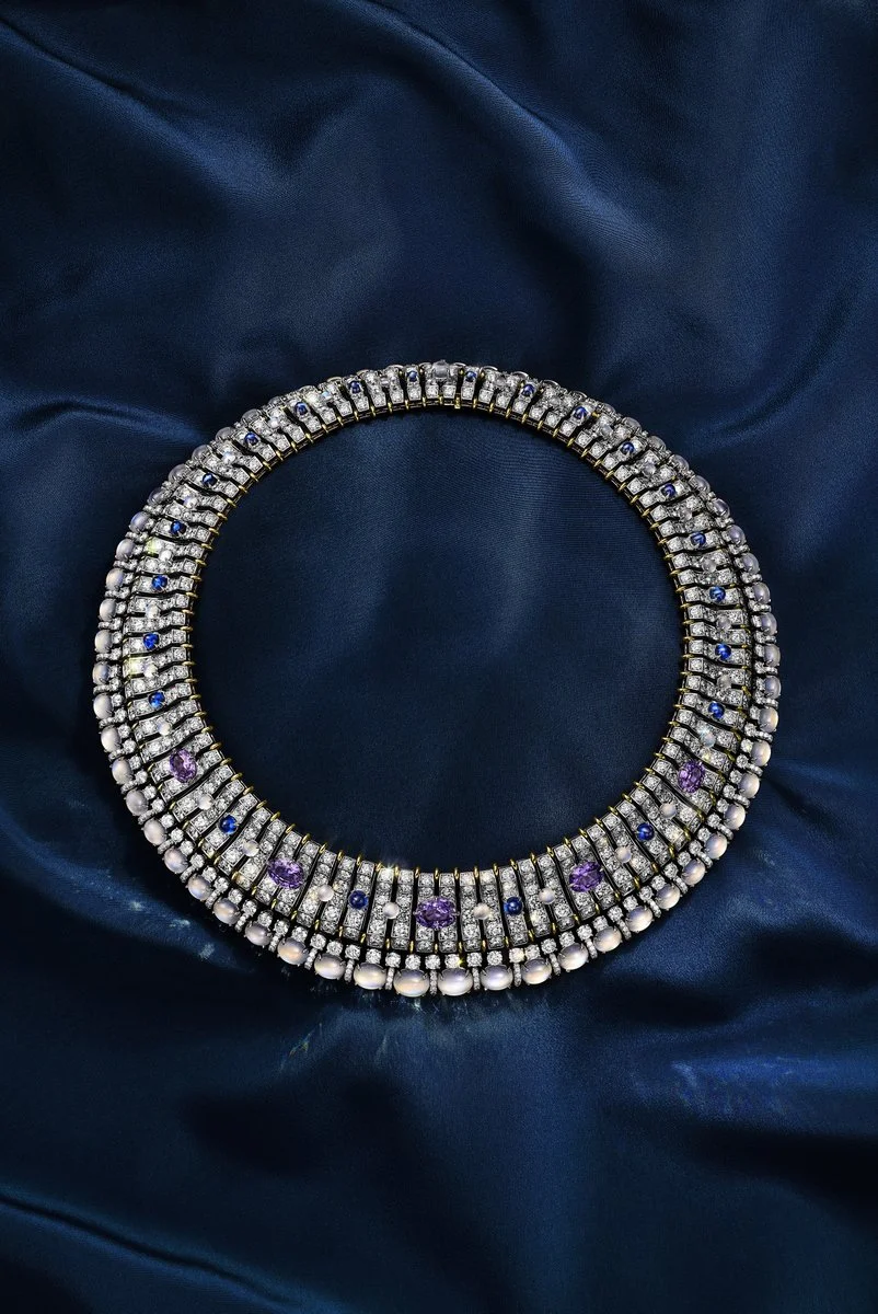 海龙幻舞(Seahorse)主题创新演绎品牌古董珍藏库的标志性元素。Nathalie Verdeille以让·史隆伯杰于1968年创作的海马胸针为灵感,为这一海洋生灵注入极具表现力的质感与对比。在未经优化处理的紫色蓝宝石、月光石、蓝色蓝宝石的精妙组合下,这一经典元素绽放出焕然一新的生命力。其中一件令人瞩目的项链,历经近1600小时的精雕细琢,镶嵌总重逾11克拉的未经优化处理紫色蓝宝石,并搭配钻石、月光石与蓝色蓝宝石。这件作品拥有三种不同佩戴方式:镶嵌蓝宝石与月光石的项链既可与月光石串链组合佩戴,亦可拆下月光石串链单独佩戴,或仅佩戴月光石串链,为佩戴者带来多元风格可能。
