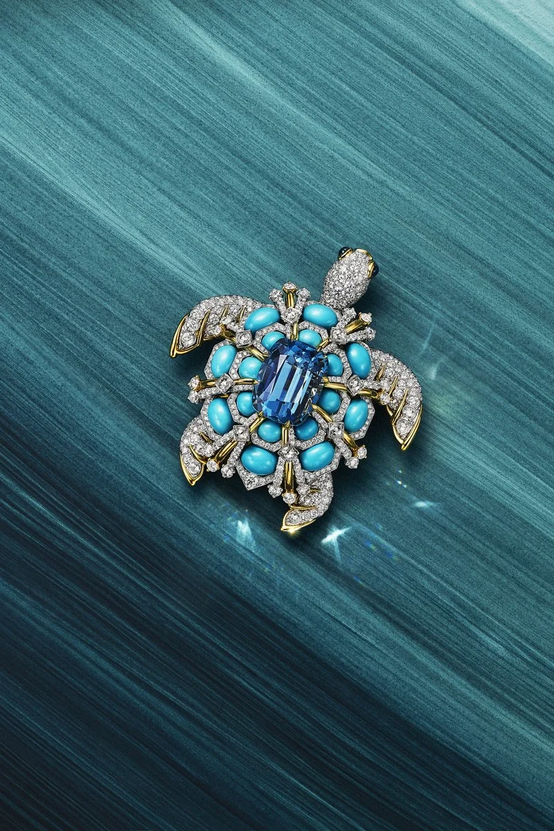 鎏金玄武(Sea Turtle)主题焕新诠释品牌1961年Blue Book中的典藏胸针,生动再现海龟的灵动游弋与龟壳的雕塑肌理。海蓝宝石与绿松石的色调呼应着海洋的美妙色谱,镶钻造型则为整体增添立体层次与视觉深度。该主题不仅呈现一款独特而又栩栩如生的海龟造型胸针,更将海龟意象融入一系列现代设计中,以当代艺术语言演绎其独特美感。