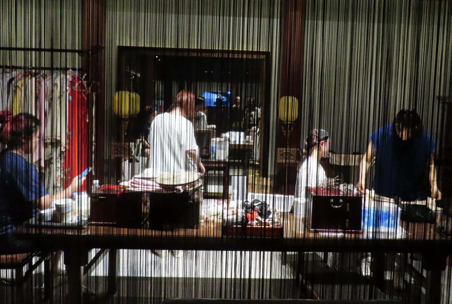 沉浸式体验的观众首先在古老的厅堂里观看拍曲展示、在室外还有古筝表演,之后还可以在半开放式的化妆间隔着垂帘,一窥戏曲演员们化妆上头面、穿戴戏服的幕后细节。